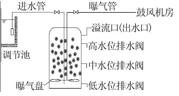 SMBBR工藝是基于移動床生物膜法(MBBR)的一種改進技術,其兼具傳統流化床和生物接觸氧化法兩者的優點,選用特殊的SDC-03型生物載體作為填料,選用特定的具有很強的生命力和旺盛的繁殖能力,能適應各種不良的環境條件的高活性反硝化菌DNF409作為菌種,組合成SMBBR工藝。SMBBR通過曝氣和水流的提升作用使填料處于流化狀態[3],提高廢水與懸浮填料的接觸次數,延長反應時間且動力消耗極低[4]。SMBBR工藝流程:綜合廢水→調節池→一級水解酸化池→單一SMBBR池→二級水解酸化池→接觸氧化池→二沉池→排水。SMBBR工藝裝置見圖1。