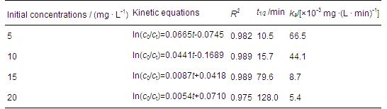 為了研究In2TiO5納米帶光催化降解MB反應動力學,測定了不同初始濃度MB條件下的降解效率.先假設MB的降解為一級反應,則其反應速率方程可表達為:ln(c0/ct)=kt,其中,c0為暗吸附后MB濃度,ct為任意時刻MB濃度.In2TiO5納米帶光催化降解不同初始濃度MB的降解曲線如圖 7所示.由圖可知,不同初始濃度的ln(c0/ct)與t的關系均具有良好的線性相關性,符合光催化降解一級動力學模型(Shamsipur et al., 2014),MB的降解反應動力學方程及相應的參數見表 2.