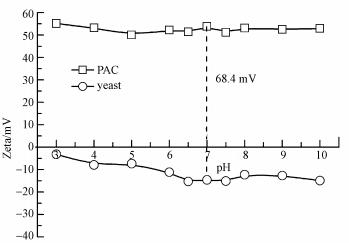 配制6.0 g · L-1的酵母細(xì)胞和0.1 mmol · L-1的PAC(聚合氯化鋁),在pH為3~10范圍內(nèi),25 ℃下測(cè)試相應(yīng)的Zeta電位值,每個(gè)對(duì)應(yīng)pH測(cè)3次,取平均值.pH調(diào)節(jié)用0.5 mol · L-1的HCl 或NaOH.