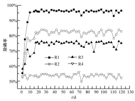長期運行過程中各反應器內磷的去除率如圖 2所示.由圖 2可知,污泥馴化階段,各反應器除磷率逐漸上升.穩定運行以后,各反應器中磷的去除效果具有較大差別,DO濃度越大,反應器中磷的去除效果越差.王曉蓮等(2005)也報道了A2O工藝好氧區在高DO濃度下運行,出水磷濃度會急劇增加,而隨后降低曝氣量,磷出水濃度則逐漸好轉.可見,高DO條件對生物除磷過程不利.