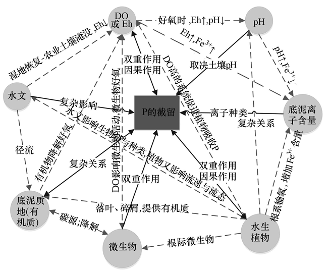 除上述因素外,濕地P的截留效應還受到黏土含量、有機質含量、磷酸鹽濃度、pH和氧化還原電位、Fe/Al/Ca離子含量等的影響,且各因素間相互作用、交互反饋(表 3、圖 2).在濕地恢復措施中,若通過引進入流來連通斷流濕地或擴大濕地面積,會導致Eh的降低,從而降低底泥的截P率:①Eh的變化進而引起pH的改變,在好氧條件下,Eh的升高會降低水體的pH,反之會帶來高的pH.而pH升高會降低濕地底泥中Fe3+含量,導致Fe結合態P濃度降低,底泥對P的截留效率下降.②Eh的改變亦可直接影響底泥離子含量,而底泥的吸附系數與Al3+和Fe3+含量有強的相關性,如Eh降低促進Fe3+被還原為Fe2+,導致Fe結合態P的水解.③Eh的變化意味著DO濃度的變化,以P:Fe的摩爾比0.33為臨界值,好氧條件下比值會小于0.33,因此有足夠的Fe與P吸附結合,相反導致多余的P釋放;高的DO濃度會促進水生植物的生長,從而增強對營養物質P的吸收.有研究指出,低DO水平((0.32±0.27)mg · L-1)時,濕地洋麻對P的截留率是高DO((4.41±0.62)mg · L-1)時的50%~51%,但晚上低濃度、白天高濃度對P去除率無明顯抑制.此外,水生植物的莖葉會向根部傳輸氧氣,影響根際的氧化還原電位、pH、底泥離子含量及根際微生物的含量,同時,水生植物的死亡凋落會增加表層底泥有機質的含量,對P的吸附作用產生影響,而有機質的礦化降解需要消耗氧氣、降低Eh,促進磷向孔隙水及上覆水的釋放.水生植物的大量生長還將阻礙水流運動,改變原有流速和流態,影響水生植物的生長,如David通過監測發現,Sagittaria lancifolia的生物量隨著淹沒時間的增長會顯著增加,Nymphaea odorata和Utricularia spp的生物量則與每年增加的水深呈明顯的負相關.④DO濃度影響微生物截P作用,好氧條件下微生物可吸收大量P,但在厭氧條件下會釋放出磷.而微生物酶對有機質的催化作用會降低Eh,其新陳代謝又將改變底泥有機質含量.