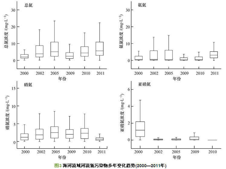 2000—2011年,海河流域河流水體中TN、NH4+-N、NO3--N、NO2--N多年變化趨勢(shì)見(jiàn)圖 3.2000年至2005年TN濃度逐漸升高,在2005年達(dá)到一個(gè)峰值為8.99 mg · L-1,2009年明顯下降,2009—2011年又逐漸升高,在2011年達(dá)到另一個(gè)峰值為7.92 mg · L-1;TN平均濃度最高為2005年的8.99 mg · L-1,最低為2000年的3.34 mg · L-1.NH4+-N濃度變化整體上呈現(xiàn)出與TN濃度變化相似的變化趨勢(shì),在2005年和2011年達(dá)到峰值,濃度分別為5.46 mg · L-1和4.25mg · L-1,NH4+-N濃度最低為2000年的2.67 mg · L-1.2002—2010年,海河流域河流水體中NO3--N濃度基本保持穩(wěn)定,2011年濃度最低,平均濃度為1.34 mg · L-1,2005年濃度最高,平均濃度為2.89 mg · L-1.NO2--N濃度呈現(xiàn)隨年份顯著降低的趨勢(shì),最高為2000年的1.76 mg · L-1.從氮素多年變化趨勢(shì)來(lái)看,NH4+-N仍然是TN的主要貢獻(xiàn)者,也是造成海河流域氮污染嚴(yán)重的關(guān)鍵因子.