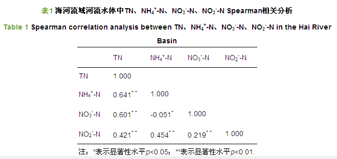 通過(guò)Spearman相關(guān)性分析(表 1),海河流域河流水體中TN濃度與NH4+-N、NO3--N、NO2--N濃度呈現(xiàn)顯著正相關(guān)(p<0.01),TN濃度與NH4+-N濃度的變化趨勢(shì)最為接近(圖 3),說(shuō)明NH4+-N濃度變化對(duì)TN濃度變化的影響最大;NH4+-N濃度與NO3--N濃度呈現(xiàn)顯著負(fù)相關(guān)(p<0.05),可能由于水體當(dāng)中的氧化還原條件促使NH4+-N與NO3--N之間發(fā)生了相互轉(zhuǎn)化;NO2--N濃度與NH4+-N、NO3--N濃度均呈現(xiàn)顯著正相關(guān)(p<0.01),NO2--N是氮循環(huán)的中間產(chǎn)物,不穩(wěn)定,可被氧化成NO3--N,在厭氧環(huán)境中也可受微生物的作用被還原為NH4+-N.