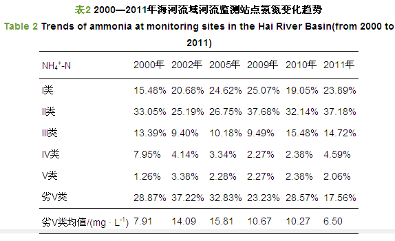 2000—2011年,NH4+-N劣V(>2.0 mg · L-1)站點(diǎn)比例整體上表現(xiàn)為減少趨勢(shì)(表 2),由2000年的28.87%降為2011年的17.56%;劣V類(lèi)站點(diǎn)NH4+-N濃度均值呈現(xiàn)整體下降的趨勢(shì),由2000年的7.91 mg · L-1降為2011年的6.50 mg · L-1;海河流域河流水體中NH4+-N濃度達(dá)到V類(lèi)水質(zhì)標(biāo)準(zhǔn)的站點(diǎn)比例整體表現(xiàn)為增加的趨勢(shì),由2000年的71.13%增加到2011年的82.44%,達(dá)IV類(lèi)水質(zhì)標(biāo)準(zhǔn)的站點(diǎn)比例由2000年的69.87%增加到2011年的80.38%;至2011年,海河流域河流水體中NH4+-N濃度達(dá)III類(lèi)水質(zhì)標(biāo)準(zhǔn)的站點(diǎn)比例為75.79%,較2000年增加了13.87%.海河流域呈現(xiàn)出氨氮污染減輕,向IV、V甚至更高水質(zhì)標(biāo)準(zhǔn)轉(zhuǎn)變的趨勢(shì).