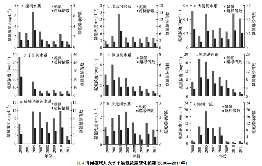 海河流域九大水系中,灤河、永定河、大清河和北三河水系河流水體中NH4+-N濃度沒(méi)有明顯的降低趨勢(shì),子牙河、漳衛(wèi)河、海河干流、黑龍港運(yùn)東水系河流水體中NH4+-N濃度隨年份降低程度較大(圖 4).黑龍港運(yùn)東水系河流NH4+-N污染最重,2000—2011年,黑龍港運(yùn)東水系河流水體中NH4+-N平均濃度為9.30 mg · L-1,超過(guò)了V類(lèi)水質(zhì)標(biāo)準(zhǔn),超標(biāo)倍數(shù)在1.6~8.8之間.其中,2001年NH4+-N平均濃度最高,為17.64 mg · L-1,2011年最低,為1.96 mg · L-1.子牙河水系河流水體中NH4+-N污染較重,2000—2011年,子牙河水系河流水體中NH4+-N平均濃度為11.91 mg · L-1,超過(guò)地表水V類(lèi)水質(zhì)標(biāo)準(zhǔn),超標(biāo)倍數(shù)為2.7~23.2,其中2000年NH4+-N平均濃度最高,為46.33 mg · L-1.灤河水系河流水體中NH4+-N污染較輕,2000—2011年,灤河水系河流水體中NH4+-N平均濃度為2.67 mg · L-1,超過(guò)地表水V類(lèi)水質(zhì)標(biāo)準(zhǔn),超標(biāo)倍數(shù)在1.3~3.4之間,其中2005年NH4+-N平均濃度最高,為6.72 mg · L-1,2011年降至1.10 mg · L-1.永定河、大清河水系河流水體中的NH4+-N含量最低,除個(gè)別年份外均在V類(lèi)水質(zhì)標(biāo)準(zhǔn)以內(nèi).2000—2011年,永定河水系河流水體中NH4+-N平均濃度為1.55 mg · L-1,在V類(lèi)水質(zhì)標(biāo)準(zhǔn)范圍內(nèi),其中2007年NH4+-N平均濃度最高,為2.34 mg · L-1,2009年最低,為0.69 mg · L-1;2000—2011年,大清河水系河流水體中NH4+-N平均濃度為0.35 mg · L-1,在地表水Ⅱ類(lèi)水質(zhì)標(biāo)準(zhǔn)范圍內(nèi),其中2000年NH4+-N平均濃度最高,為0.52 mg · L-1,2001年最低為0.16 mg · L-1.