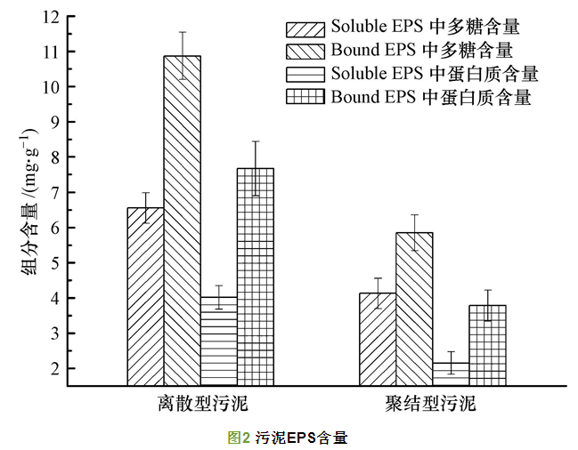 采用2.3.2節中所述方法測定兩種污泥的胞外聚合物,結果如圖 2所示.胞外聚合物是微生物細胞分泌的粘性物質,主要成分為多糖和蛋白質等物質.其中,Bound EPS主要是緊密結合在細胞外殼的束縛性聚合物及附著有機物,Soluble EPS主要是可溶解的大分子物質、膠體和粘液. 數據顯示,離散型污泥單位質量MLVSS中的Bound EPS和Soluble EPS更高,這一結果與其他學者的研究結果相符.EPS的含量與污泥的沉降性能呈負相關.離散型污泥EPS含量更高,導致污泥表面電負性較大,絮體表面的凈負電荷可以在絮體之間產生排斥勢能,導致污泥結構變得松散.