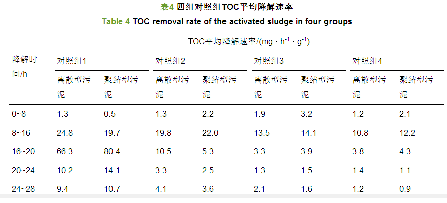 COD與TOC存在一定的相關性,實驗結果中二者在數值和變化規律上基本吻合.結果表明,在最初的8 h中,降解速率較低,大部分有機物在8~20 h中得到降解.對照組1由于污泥濃度小,有機物負荷更高,因此,每克污泥有機質所降解的有機物更多,其降解速率最大值出現在16~20 h. 對照組2、3、4降解速率最大值出現在8~16 h. 在這個時間段中對照組1中離散型污泥降解速率更高,而在對照組2、3和4中聚結型污泥降解速率更高.由于微生物活性差異較小,因此,在對照組1和2中兩種污泥的有機物平均降解速率沒有明顯規律,而在高污泥濃度的對照組3和4中,有機物平均降解速率呈現的規律較為明顯,離散型污泥的有機物平均降解速率要低于聚結型污泥.