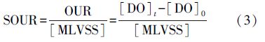 式中,[DO]0、[DO]t分別為測定初始時和終止時的溶解氧濃度(mg · L-1),t為測定時間(h),[MLVSS]為揮發性懸浮固體濃度(mg · L-1).