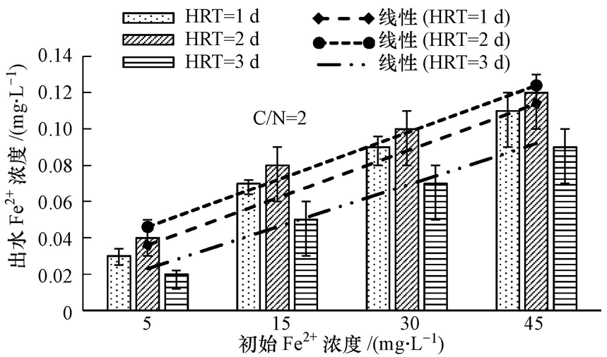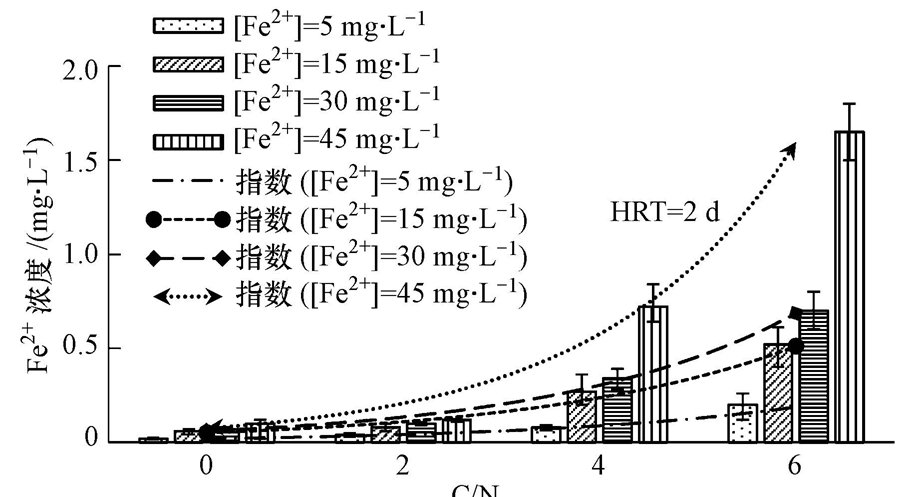 由以上可知,不同HRT時(shí)Fe2+對(duì)人工濕地反硝化作用的影響規(guī)律基本一致,故本節(jié)選取HRT為2 d研究不同C/N對(duì)Fe2+參與的反硝化作用影響.