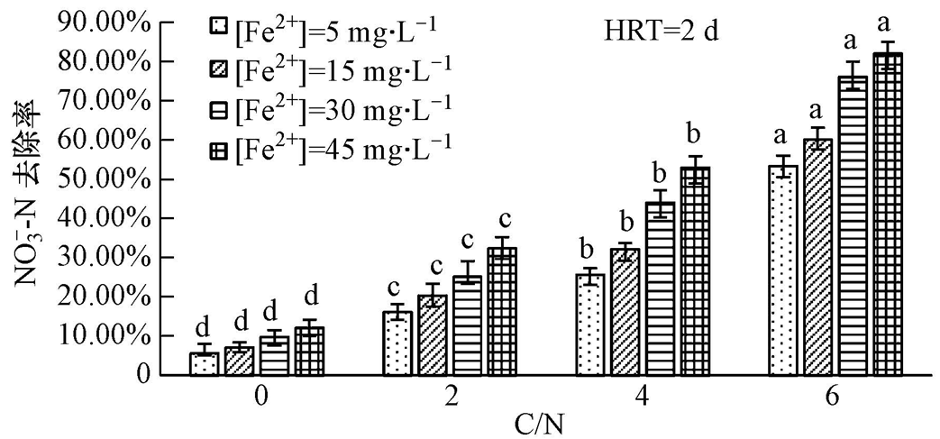 圖1 不同初始進(jìn)水Fe2+濃度硝氮去除率(注:圖中表示在相同HRT下,不同初始Fe2+濃度硝氮去除率的顯著性比較(n=3),其中同系列柱形圖上具有相同字母的表示差異不顯著(p<0.05)
