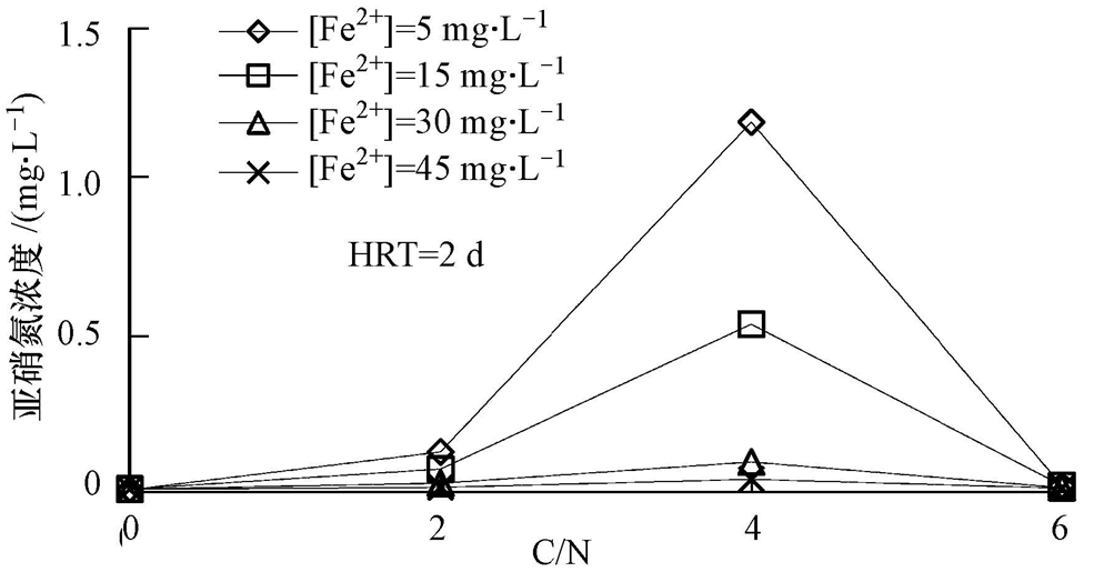 由圖 6可見(jiàn)隨C/N的增加,NO2--N的濃度先增加后減少,在碳氮比為4時(shí)出現(xiàn)了最大值,達(dá)到1.2 mg · L-1.陸松柳的研究中也發(fā)現(xiàn)不加碳源的人工濕地出水亞硝氮濃度為0.1 mg · L-1,而添加碳源后約為3 mg · L-1,表 明碳源的添加會(huì)導(dǎo)致亞硝氮的積累.本研究加入了Fe2+,結(jié)果表明出水NO2--N濃度有所減少,且隨初始Fe2+濃度增加,NO2--N的濃度逐漸減少.這說(shuō)明亞鐵可以促進(jìn)人工濕地反硝化作用的進(jìn)行,減少亞硝態(tài)氮的積累,原因可能是亞鐵可以作為電子供體參與人工濕地的反硝化作用.
