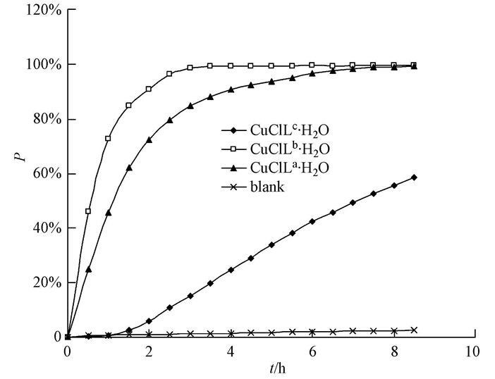 從圖 3可以發現,CuClLa·H2O在5 min之前有明顯的延至期,而CuClLb·H2O延至期小于2 min.結合圖 2和圖 3,CuClLa·H2O在2 h以后進入底物耗盡期,而 CuClLb·H2O在1.5 h以后進入底物耗盡期.
