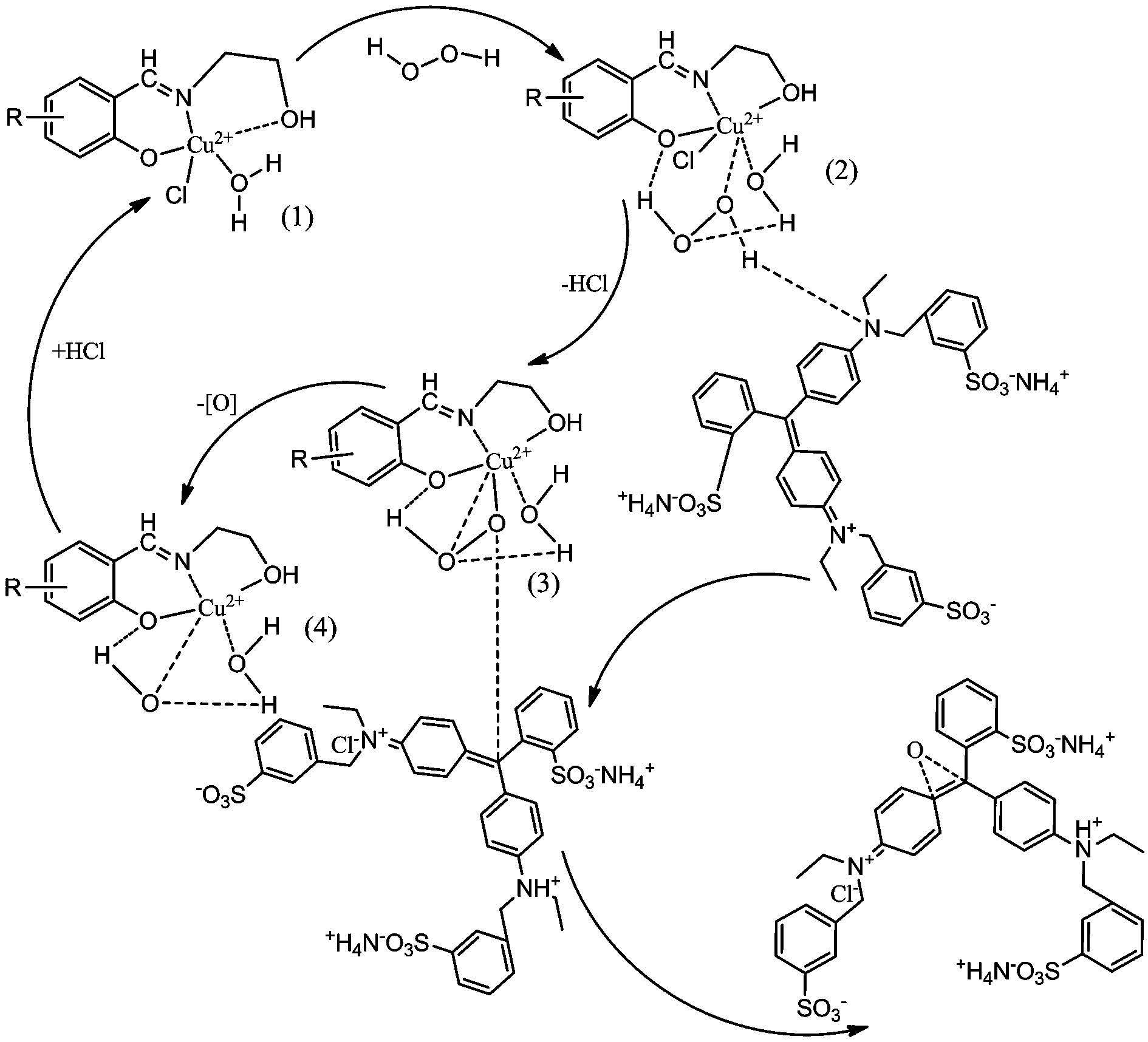 Cu2+形成配合物時,最多可以提供6個配位點,生成八面體結構,Cu2+處在八面體的中心.而配合物CuClLa·H2O、CuClLb·H2O、CuClLc·H2O均為5配位結構,在軸向上可以允許其它的配體插入,生成6配位的結構.如圖 7所示,底物之一H2O2的過氧鍵中的一個O原子與中心離子Cu2+配位占據軸向位置產生6配位結構的中間結構(2),H2O2中的2個H原子分別與配體L的酚氧的O原子和物之二酸性藍9中叔胺中的N原子生成氫鍵,同時H2O2中的另一個O原子與配位H2O中的H原子發生氫鍵結合. 由于Cu2+的誘導激化作用和氫鍵網的作用,導致催化劑中的Cl-和H2O2的一個H+離去,H2O2的兩個O原子同時參與配位,催化劑轉化為圖 7中的6配位結構(3),同時H2O2中的一個O原子進攻底物酸性藍9中的三苯甲烯C原子,失去一個活性O,催化劑形成圖 7中的5配位結構(4),(4)中有一個HO-配體與反應體系中的Cl-交換,生成(1),實現催化劑的循環過程.可見由于配位中心的這種配位誘導極化和周圍的氫鍵作用,加快了H2O2的過氧鍵的斷裂,生成活性O原子,加快了染料的降解進程,而且降解徹底.而給電子基團有利于酚氧中的O原子參與氫鍵網,促進H2O2的過氧鍵的斷裂,有利于催化性能的提高,所以CuClLb·H2O中由于CH3O—的引入,所以CuClLb·H2O的活性優于CuClLa·H2O;大的位阻基團引入,不利于底物之二酸性藍9的靠近,不利于氫鍵網的生成,不利于H2O2的過氧鍵的斷裂,不利于催化性能的提高,所以CuClLc·H2O中由于2個(CH3)3C-的引入,位阻增加,所以CuClLc·H2O的活性不如CuClLa·H2O活 性.所以催化性能是CuClLb · H2O最好,CuClLa · H2O 其次,CuClLc·H2O最差,這與表 2和圖 2的結果一致,說明催化劑的循環機理是合理的.具體參見污水寶商城資料或http://www.xhxdt.com更多相關技術文檔。