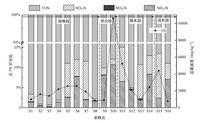 圖 2 滏陽河表層沉積物氮素空間分布特征