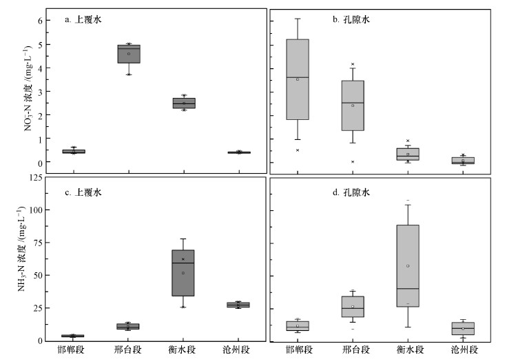 圖 4 滏陽河上覆水和孔隙水硝氮、氨氮濃度空間分布特征