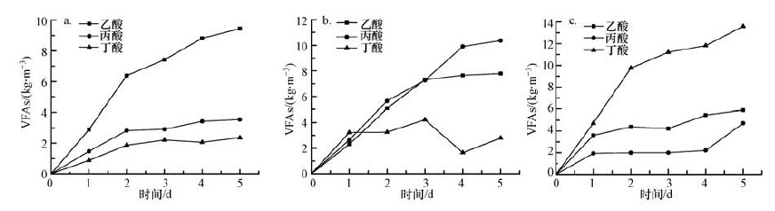 分別設定底物初始C/N比值為12、56、156,進行厭氧發酵.發酵過程中時,體系中有機酸的產量分別如圖 1所示.由圖 1可以看出,底物初始C/N比不同,厭氧發酵產生的末端酸化產物也不同.C/N比為12時,產量最大的為乙酸,在第5 d達到9.45 kg·m-3(以COD計,下同);其次是丙酸,第5 d時可以達到3.55 kg·m-3;最低是丁酸,第5 d時產量約為2.35 kg·m-3(圖 2a).當C/N比為56時,產量最大的為丙酸,在第5 d可達到10.36 kg·m-3;其次是乙酸,可以達到7.79 kg·m-3;最低是丁酸,產量約為2.79 kg·m-3(圖 2b).當C/N比為156時,產量最大的為丁酸,在第5 d達到13.59 kg·m-3;其次是乙酸,可以達到5.89 kg·m-3;最低是丁酸,產量約為4.72 kg·m-3(圖 2c).