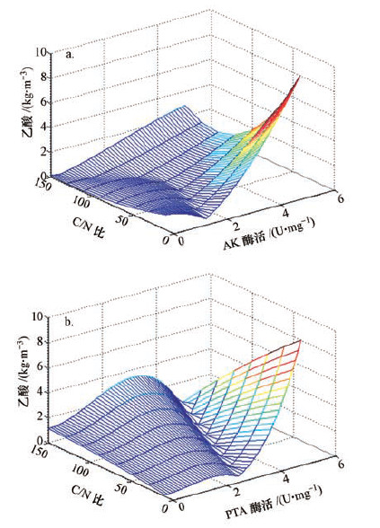 根據定量關系式(4)和(5)繪制得到圖 3的可視化曲面模型.從圖 3的曲面模型可以看出:在初始C/N比為10~50時,酶活性較低,乙酸激酶(AK)和磷酸轉乙酰酶(PTA)平均酶活性分別為1.06 U·mg-1和0.67 U·mg-1,而乙酸濃度從2.8 kg·m-3(以COD計,下同)上升到7.8 kg·m-3.在初始C/N比為50~150時,AK和PTA酶活性較高,平均值分別為2.79 U·mg-1和1.08 U·mg-1,而乙酸濃度為2.6 kg·m-3.從以上數據可知,酶活性水平和乙酸產量不一致,說明在此C/N比條件下,乙酸主要不是通過丙酮酸途徑合成,而可能是通過丙酸、丁酸的轉化形成.其他學者的研究都表明(任南琪等,2005;劉曉玲,2008),C/N比通過直接或間接影響產能過程及NADH(或NADPH)/NAD+(或 NADP+)的氧化還原偶聯過程,促使不同發酵產酸類型的形成.在低C/N比條件下,乙酸的產生主要是通過氨基酸之間的Stickland反應形成,本文的曲面模型很好地解釋了這一結論.