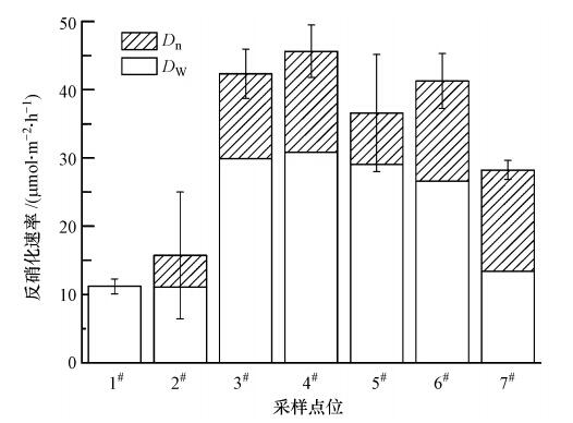 洲灘沉積物的平均反硝化速率為(35.36±6.12)μmol · m-2 · h-1,其中,6#點位的反硝化速率最高(41.29 μmol · m-2 · h-1),7#點位反硝化速率最低(28.22 μmol · m-2 · h-1),但洲灘沉積物3個點位之間反硝化速率差異不顯著.洲灘沉積物的非耦合反硝化速率和耦合反硝化速率均值分別為23.02 μmol · m-2 · h-1和12.34 μmol · m-2 · h-1.