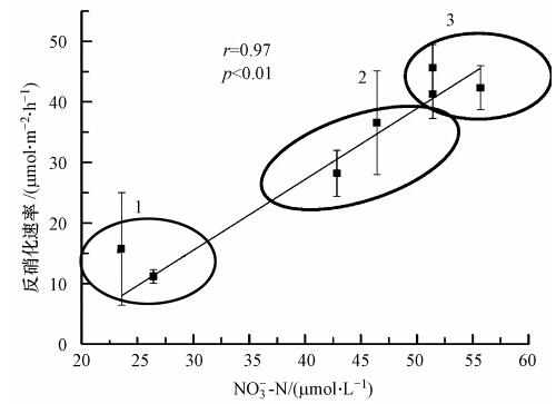 圖 4 沉積物反硝化率與上覆水硝酸鹽的關系(誤差線為標準誤差,n=3)