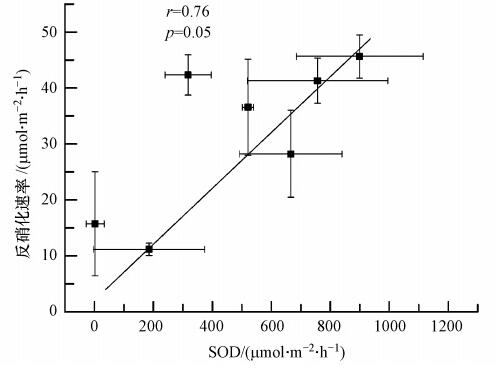 圖 5 沉積物反硝化速率與SOD的關系(誤差線為標準誤差,n=3)