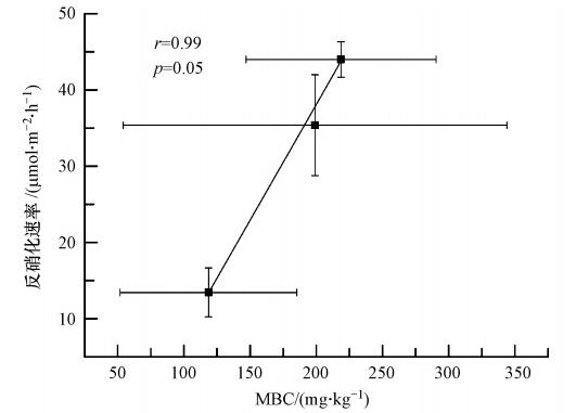 圖 6 沉積物反硝化速率與MBC的關系(誤差線為標準誤差,n=3)