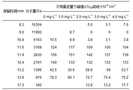 預(yù)氯化不僅能夠影響DOM濃度,還會影響其分子量分布.對氯化后水中有機(jī)物進(jìn)行凝膠色譜分析,結(jié)果如表 3所示.預(yù)氯化后,保留時間為8.3 min的有機(jī)物(分子量為16304 Da)濃度升高,說明氯化過程中有胞內(nèi)大分子化合物(如蛋白質(zhì)和多糖)的釋放.氯投量從1.0 mg · L-1升高至4.0 mg · L-1時,保留時間為11.6、11.9和12.4 min的有機(jī)物(分子量分別為3168、2830和2191 Da)濃度降低,而保留時間為17.3 min的有機(jī)物(分子量為180 Da)濃度升高.這是由于在預(yù)氯化過程中藻細(xì)胞釋放出的有機(jī)物會與氯反應(yīng).此外,由于較小分子量和較低芳香度的有機(jī)物有著較大的E250/E365比值(即DOM在波長250和365 nm處的吸收比)(Peuravuori et al., 1997),氯投量對DOM的E250/E365值的影響趨勢(表 2)也支持上述對氯化后DOM分子量分布的論述.