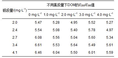 表4 預(yù)氯化對混凝后DOM的E250/E365值的影響