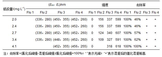 此外,與腐殖酸和富里酸相比,蛋白質(zhì)物質(zhì)和溶解性微生物代謝物更易與鋁鹽混凝劑反應(yīng),從而被混凝去除.如表 5所示,混凝之后溶液中類蛋白質(zhì)物質(zhì)(Flu 1)和溶解性微生物代謝物(Flu 2)的熒光峰峰強(qiáng)下降,相較而言,腐殖質(zhì)類有機(jī)物(Flu 3和Flu 4)的熒光峰峰強(qiáng)在混凝之后反而升高了70%~74%.從表 5中可進(jìn)一步看出,類蛋白質(zhì)物質(zhì)可能比溶解性微生物代謝物更易被鋁鹽混凝去除.鋁投量為2.0 mg · L-1時,熒光峰Flu 1完全消失,而熒光峰Flu 2強(qiáng)度僅下降46%.