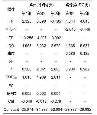 判別分析(DA)是多變量統(tǒng)計分析中用于判別樣品所屬類別的一種統(tǒng)計分析方法.可以用來判別CA分析結(jié)果和識別顯著性的污染指標(biāo).此方法分為3類:標(biāo)準(zhǔn)式、前進式和后退式.相比之下,后退式DA方法具有更好的指標(biāo)降維能力和判別能力.所以,本文利用后退式DA方法對原始數(shù)據(jù)進行時空差異性分析,并采用交叉驗證法(Cross-validation)檢驗此方法的判別能力.相應(yīng)的判別函數(shù)表達式如下: