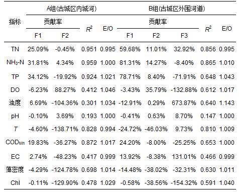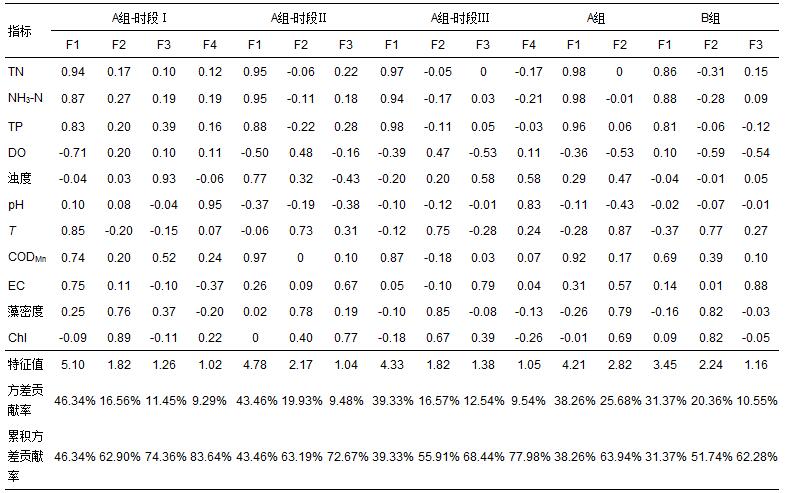 在A組-時段Ⅲ:F1的方差貢獻率為39.33%,表征因子為TN、NH3-N、TP和CODMn,與DO呈一定的負(fù)相關(guān),與時段Ⅰ類似.F2的方差貢獻率16.57%,表征因子為T、藻密度和Chl,且呈正相關(guān),與pH呈負(fù)相關(guān),與時段Ⅱ類似.F3的方差貢獻率12.54%,表征因子為DO和EC.F4的方差貢獻率9.54%,表征因子為濁度和pH.蘇州古城區(qū)在時段Ⅲ和時段Ⅰ、時段Ⅱ一樣,主要受到生活污水的污染及耗氧有機物污染,不同的是,隨著溫度的進一步升高,藻類大量的繁殖達到頂峰,由時段Ⅰ到時段Ⅲ的平均藻密度由1009.78 cells · mL-1增長到了2076.74 cells · mL-1,與此同時pH值由7.24降到7.17.