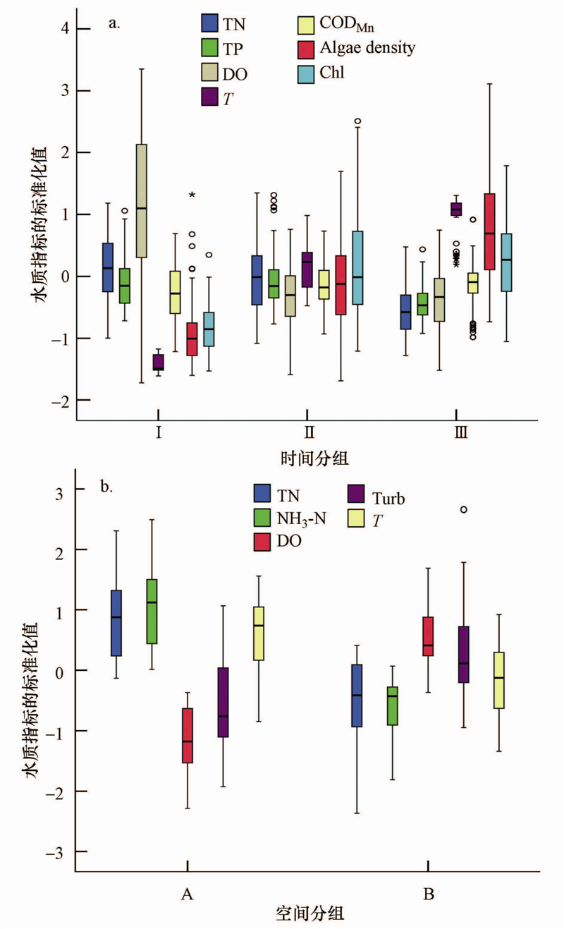 時間尺度聚類分析與判別分析結(jié)果表明:全年可分為3個時段(圖 3),時段Ⅰ(1—3月)、時段Ⅱ(11月、4—6月)和時段Ⅲ(7—10月),水體污染程度由重到輕依次為時段Ⅰ、時段Ⅱ、時段Ⅲ.時間聚類結(jié)果的判別分析交叉驗證正確率(表 3)達到88.1%,表明全年分3個時段是比較合適的.判別函數(shù)(表 4)用了7個監(jiān)測指標(biāo):TN、TP、DO、T、CODMn、藻密度、Chl,體現(xiàn)古城區(qū)河網(wǎng)水質(zhì)的時間差異性規(guī)律.從蘇州古城區(qū)水體污染物時間尺度的差異性圖(圖 4a)中可以看出總體上、時段Ⅰ、時段Ⅱ和時段Ⅲ,TN、TP、DO和CODMn隨著時間的推移濃度在逐漸減少.同時,T 及藻密度和Chl隨著時間的推移逐漸在升高.