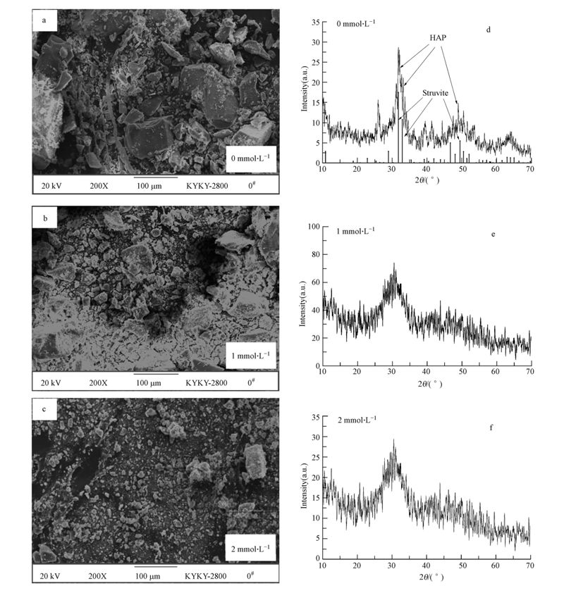 圖 3是溶液pH值為9.0條件下,檸檬酸濃度分別為0、1和2 mmol · L-1時所得CP結晶沉淀反應產物的SEM照片與XRD分析圖譜.從圖中可以看出,在不同濃度檸檬酸條件下,反應產物基本上都呈現無定形的塊狀,形狀沒有太大的改變,但晶體的大小分布有所區別(圖 3a~c).在沒有檸檬酸存在條件下,所得產物體積較大,以大塊晶體為主.隨著溶液中檸檬酸濃度的增加,反應所生成的產物顆粒個體逐漸變小,在實驗過程中也能觀察到沉淀顆粒細小,且數量減少、沉降性能變差,這可能是由于檸檬酸影響了晶體的成核速率和生長速率.多晶X射線衍射分析數據表明,檸檬酸濃度為0 mmol · L-1時,通過與標準峰(PDF 76-0694)對比,可以確定晶體的分子式為Ca5(PO4)3OH,產物為HAP晶體(圖 3d).然而,從圖 3e、f可以看出,當檸檬酸濃度為1 mmol · L-1和2 mmol · L-1時,所得產物晶形發生顯著變化.這可能是由于檸檬酸與Ca2+強烈結合成檸檬酸類絡合物,且隨著溶液中檸檬酸濃度升高,絡合程度增加,導致CP反應的產物多樣化.因此,檸檬酸對結晶反應產生抑制作用的同時,也會對結晶產物的大小和成分造成影響.