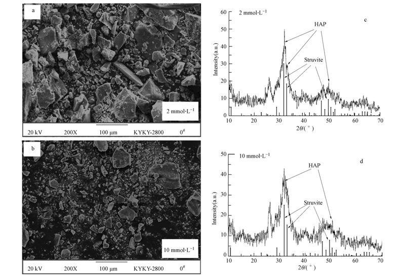 圖 7表示的是溶液pH值為9.0條件下,乙酸濃度分別為2和10 mmol · L-1時所得CP結晶沉淀反應產物SEM照片與XRD分析圖譜.從圖中可以看出,在不同乙酸濃度下得到的結晶產物形貌均呈 不規則塊狀(圖 7a、b),晶體產物的形狀沒有發生明顯變化,但晶粒大小有所不同.隨著溶液中乙酸濃度的增加,反應所得顆粒體積明顯變小,沉淀性能降低.從圖 7c、d可見,通過將X射線衍射圖譜的三強峰與標準峰對照,可以確定晶體結構為磷酸鈣(Ca5(PO4)3OH),結晶產物基本一致.乙酸對結晶產物的形狀及成分均沒有明顯影響,但會影響產物體積大小,進而影響其沉淀性能.具體參見污水寶商城資料或http://www.xhxdt.com更多相關技術文檔。
