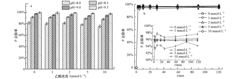 在一定pH值條件下,乙酸濃度對CP結晶沉淀反應溶液中磷的最終去除率影響很小.從圖 6a中可以看出,當pH值為8.0時,溶液中乙酸濃度從0 mmol · L-1 增加到10 mmol · L-1,磷的去除率僅下降5%左右.當pH值為8.5、9.0和9.5時,不同濃度乙酸對磷的去除率幾乎沒有影響.此外,不同乙酸濃度對磷的去除速率也基本上沒有影響,CP結晶沉淀反應均能在5 min內達到平衡(圖 6b).由于乙酸也可能與Ca2+按反應式(4)發生絡合作用,但這種絡合程度較弱,因此,乙酸對磷酸鈣結晶反應影響很小.