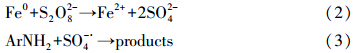 根據以上實驗結果和分析,在Fe0-PS連續流體系中,NB的還原氧化降解機理如式(1)~(3)所示,即NB被Fe0還原后生成AN,Fe0被氧化成Fe2+,此時TOC并未降低;Fe2+與PS構成類Fenton體系,產生強氧化性物種硫酸根自由基,從而降解AN,TOC去除明顯.對反應后pH值進行檢測,發現在未調pH的前提下,對于NB還原體系,反應后pH變化不大,略有上升;而對于NB還原氧化體系,pH變化非常明顯,迅速降為3左右,進一步佐證了上述反應機理.