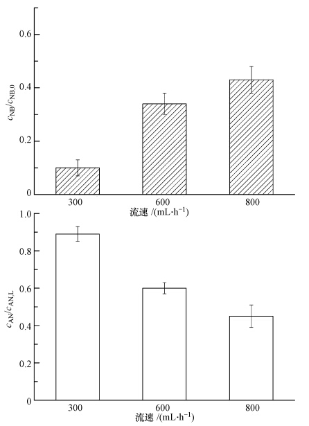 由圖 4可知,在300、600、800 mL · h-1的流速條件下,隨著流速的增加,NB的降解率降低.研究表明,Fe0還原NB中,Fe0表面的還原反應是主要的控制反應.因此,隨著NB溶液的流速越快,在還原性鐵柱中的停留時間越短,NB與Fe0表面的接觸時間越少,還原率隨之降低.