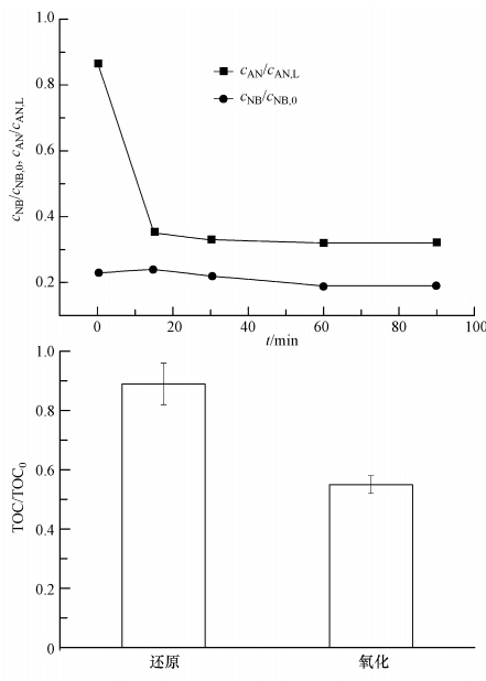 測試方法:NB和AN濃度采用經典的N-(1-萘基)乙二胺偶氮分光光度法測定;以cNB/cNB,0來表征NB的剩余量(cNB為任一取樣時刻NB的濃度,cNB,0為NB的初始濃度);以cAN/cAN,L來表征AN變化量(cAN為任一取樣時刻AN的濃度,cAN,L為NB理論還原生成AN的濃度);其中,AN變化量中的cAN,L=cNB,0×nAN/nNB(nAN/nNB為AN和NB的摩爾比).Fe2+的濃度采用鄰菲啰啉分光光度法測定.測Fe2+濃度時在還原性鐵柱末端取樣.