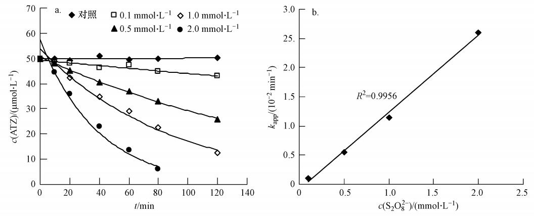 過硫酸鹽的濃度顯著影響了ATZ的降解速率,如圖 1a所示,ATZ的降解速率隨著過硫酸鹽濃度的升高而加快.過硫酸鹽濃度為0.1 mmol · L-1時,在2 h內ATZ基本沒有去除;當過硫酸鹽濃度增加到2.0 mmol · L-1,反應2 h后,ATZ的去除率超過98%.此外,ATZ的降解曲線可以用一級反應動力學方程擬合: