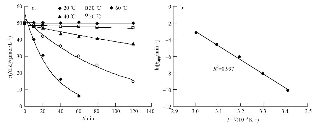 考查了20~60 ℃之間ATZ的降解情況,結果如圖 2a所示.在各溫度下,反應均呈假一級動力學規律.隨著溫度的升高,降解顯著加快,20 ℃時,ATZ的降解半衰期為17385.1 min,60 ℃時,半衰期僅為22.6 min.Ghauch等(2012b)用熱活化過硫酸鹽技術降解Ibuprofen時也發現,隨著溫度從50 ℃升到60 ℃,60 min內Ibuprofen的去除率從12%升高到75%.這一方面是因為溫度升高增加了S2O2-8的活化效率,增加了溶液中活性自由基的濃度,即方程(2)中的α值;另一方面,反應速率常數k也隨溫度升高而變大,這是一般的反應動力學規律.kapp隨反應溫度T的變化如圖 2b所示,兩者之間的關系遵循阿累尼烏斯方程: