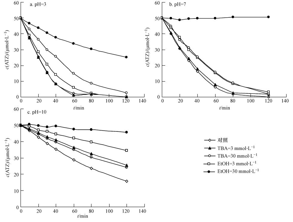 圖 4 在pH為3.0、7.0、10.0時EtOH和TBA作為自由基抑制劑對ATZ降解的影響(60 ℃,[ATZ]0=50 μmol · L-1,[S2O2-8]0=1.0 mmol · L-1)