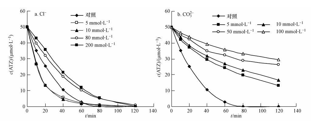圖 6 Cl-(a)和CO2-3(b)對ATZ降解的影響(60 ℃,pH=7.0,[ATZ]0=50 μmol · L-1,[S2O2-8]0=1.0 mmol · L-1)