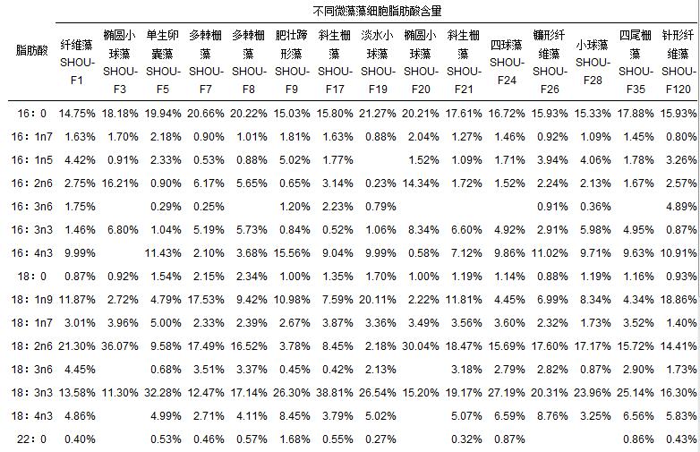 試驗用15個藻株均取自上海海洋大學生物餌料研究室微藻種庫,分別為纖維藻(Ankistrodesmus sp.)SHOU-F1、橢圓小球藻(Chlorella ellipsoidea)SHOU-F3、單生卵囊藻(Oocystis solitaria)SHOU-F5、多棘柵藻(Scenedesmus spinosus)SHOU-F7、多棘柵藻(S. spinosus)SHOU-F8、肥壯蹄形藻(Kirchneriella obesa)SHOU-F9、斜生柵藻(S. obliquus)SHOU-F17、淡水小球藻(Chlorella sp.)SHOU-F19、橢圓小球藻(Ch.ellipsoidea)SHOU-F20、斜生柵藻(S.obliquus)SHOU-F21、四球藻(Tetrachlorella alternans)SHOU-F24、鐮形纖維藻(A.falcatus)SHOU-F26、小球藻(Chlorella sp.)SHOU-F28、四尾柵藻(S. quadric and a)SHOU-F35和針形纖維藻(A. acicularis)SHOU-F120.