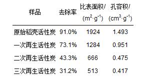 考慮到環(huán)保和重復(fù)利用的問(wèn)題,需要對(duì)使用過(guò)的活性炭進(jìn)行回收再利用.采用簡(jiǎn)便的熱處理方法對(duì)稻殼活性炭的再生性能進(jìn)行了初步評(píng)價(jià).將吸附到飽和后的稻殼活性炭,低溫干燥后,置于馬弗爐中在300 ℃條件下熱處理40 min,再次用于甲基橙的吸附,其去除率、比表面積和孔容積變化結(jié)果如表 4所示.