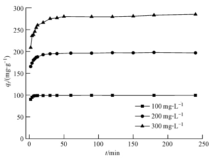 圖 10為在不同初始濃度條件下甲基橙在稻殼活性炭上的吸附動(dòng)力學(xué)曲線.由圖 10可知,100、200和300 mg · L-1的甲基橙溶液吸附平衡時(shí)間分別在20、40和50 min.開(kāi)始時(shí)吸附速率較快,是由于存在大量活性位點(diǎn),隨著活性位點(diǎn)被占據(jù)減少,吸附速率減緩.隨著初始濃度的上升,吸附質(zhì)對(duì)活性位點(diǎn)的競(jìng)爭(zhēng)吸附加劇,吸附平衡時(shí)間延長(zhǎng).而通過(guò)動(dòng)力學(xué)的研究,能夠很好的反應(yīng)稻殼活性炭對(duì)甲基橙的吸附機(jī)制和控制過(guò)程.為了考察甲基橙在稻殼活性炭上的吸附行為,分別采用準(zhǔn)一級(jí)吸附速率方程、準(zhǔn)二級(jí)吸附速率方程和顆粒內(nèi)擴(kuò)散速率方程對(duì)甲基橙的吸附行為進(jìn)行擬合.