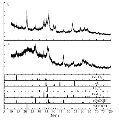 圖 7兩種鐵溶出顆粒物的XRD圖譜(a.單向連續流動實驗, b.密閉循環流動實驗)