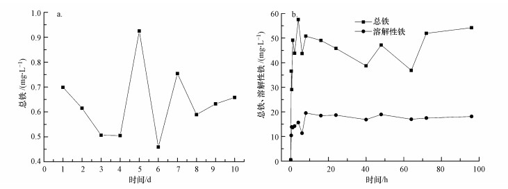 圖 5單向連續流動實驗中總鐵(a)及密閉循環流動實驗中總鐵和溶解性鐵(b)的變化