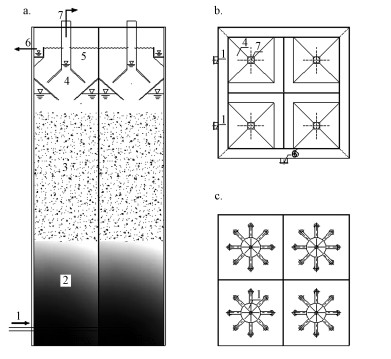 圖 2 UASB反應(yīng)器示意圖(a.剖視圖, b.頂視圖, c.底視圖; 1.進(jìn)水, 2.污泥層, 3.懸浮層, 4.三相分離器, 5.沉淀區(qū), 6.出水, 7.氣體)