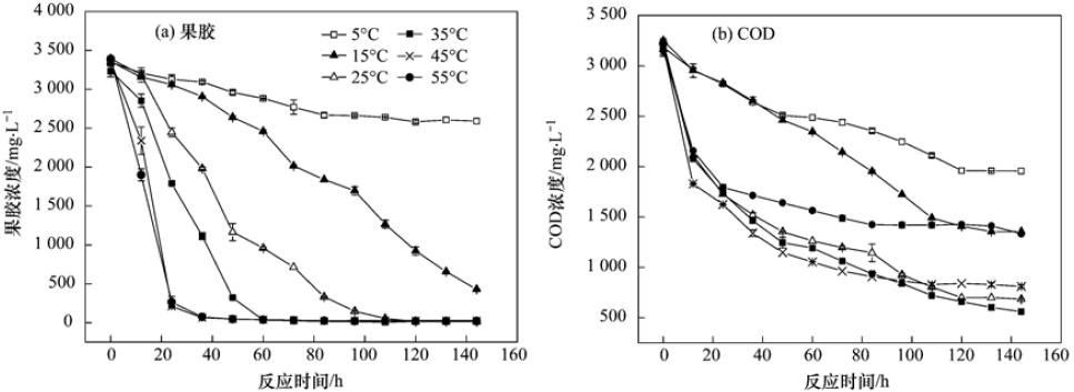 (3)溫度越高,降解果膠所需的時間越短. 5℃時,降解144 h后,出水果膠濃度為2589.6 mg ·L-1,而溫度為55℃時僅需36 h,出水果膠濃度可在80 mg ·L-1以下. 隨著溫度在5~35℃范圍內變化,厭氧污泥對果膠廢水中COD的去除率從38.6%逐漸增加到91.5%,當溫度高于35℃時,厭氧污泥對果膠廢水中COD的去除率逐漸降低.