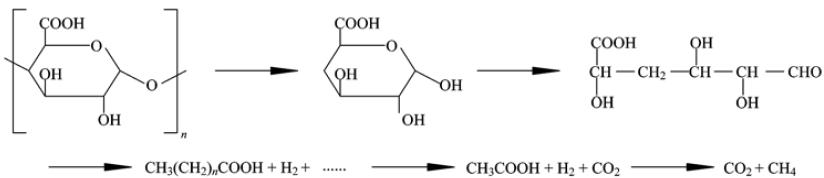 果膠分子中的單體半乳糖醛酸中的C—O—C鍵首先斷裂,果膠分子聚合度下降,然后低聚合度的中間體近一步降解生成揮發性酸、 H2等,最后被徹底分解成CH4和CO2.具體參見污水寶商城資料或http://www.xhxdt.com更多相關技術文檔。