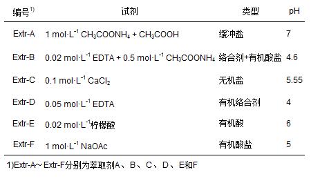 土壤中金屬元素生物可利用態(tài)的提取劑大致有三類:以無(wú)機(jī)鹽為主的提取劑,使用濃度較大,在性質(zhì)上代表了金屬元素的陽(yáng)離子可代換部分; 弱酸類,在性質(zhì)上模擬了植物根系有機(jī)酸分泌所造成的微酸性環(huán)境; 有機(jī)絡(luò)合物,使用濃度較低,在性質(zhì)上模擬了植物根系有機(jī)酸分泌物對(duì)金屬元素吸附的部分[12, 14].稱取采集的污泥濕樣各6 g于50 mL的離心管中,按萃取液與污泥干重比12 L ∶1 kg加入不同類型的萃取劑溶液(表1),萃取污泥中生物可利用態(tài)重金屬[15].樣品溶液充分搖勻后將離心管放置于回旋式振蕩器,轉(zhuǎn)速為230 r ·min-1,振蕩5 h,離心分離后,用0.45 μm濾膜過(guò)濾萃取液到PE小瓶,采用原子吸收光譜法(AAS,福立AA1700)測(cè)定萃取液中重金屬的濃度,以干重計(jì)算污泥中重金屬生物可利用態(tài)含量.每個(gè)樣品平行萃取3次.